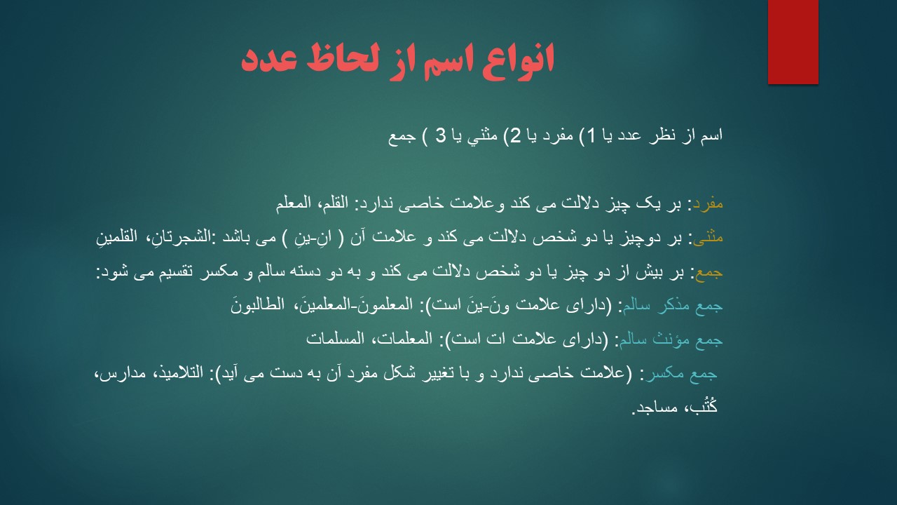 قواعد عربی(علم صرف،اقسام کلمه،معرفه و نکره،انواع اسم از نظر تعداد)
